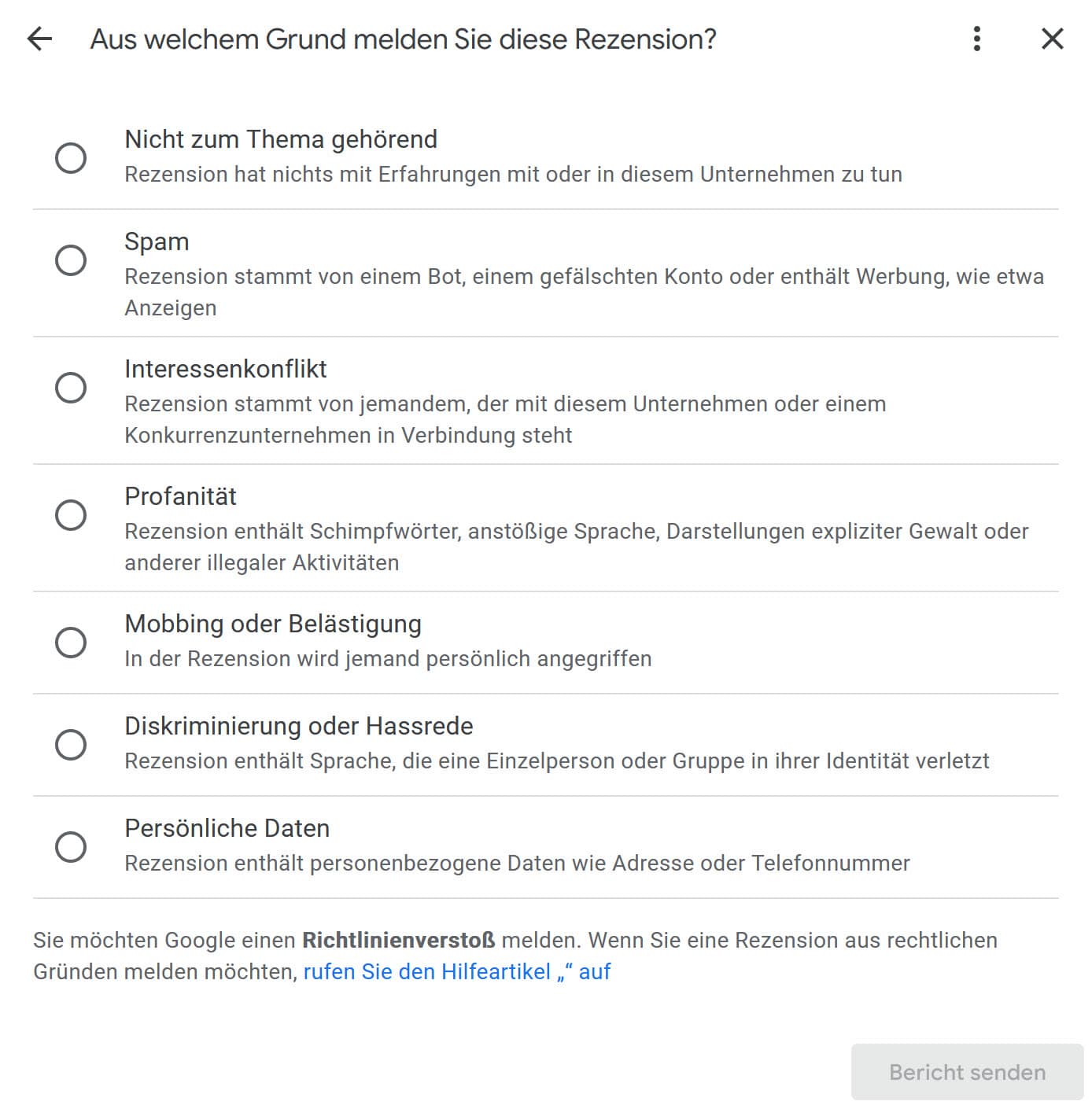 Unternehmen haben die Möglichkeit, negative Rezensionen auf Google zu melden und so eine Löschung anzuregen.