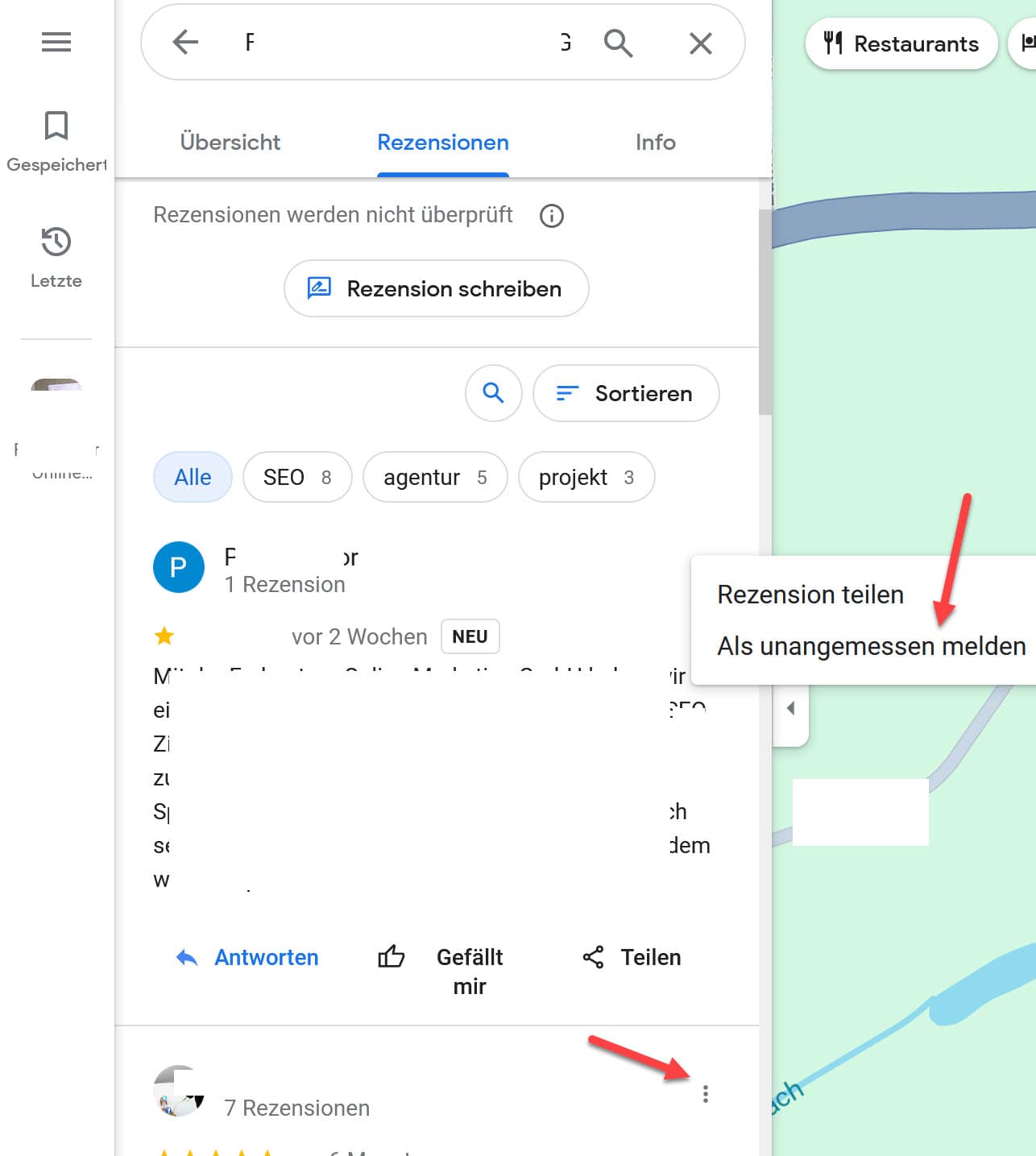 Gehen Sie dazu in Google Maps auf die entsprechende Bewertung. Rechts daneben finden Sie ein Dreipunkt Menü. Dort können Sie die Option „Rezension melden“ auswählen.